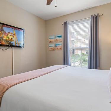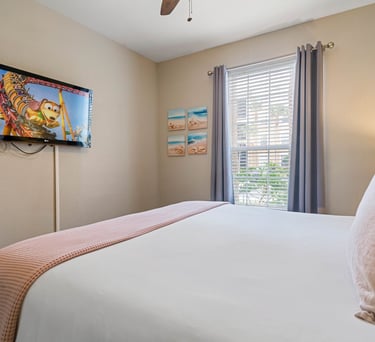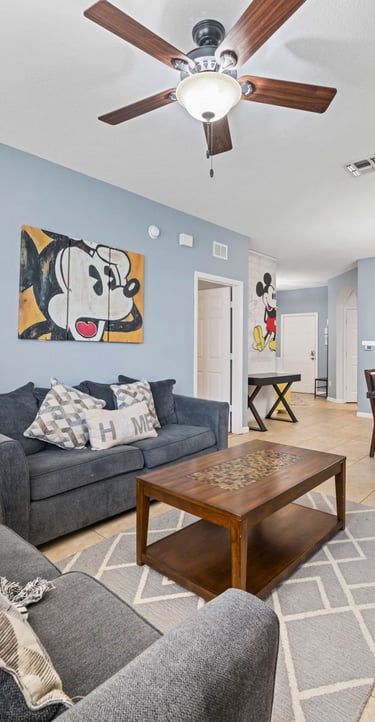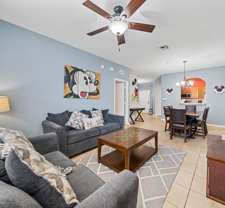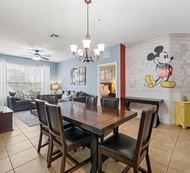 As you enter the main area, you'll be greeted by a vibrant and inviting living area adorned with beloved Disney characters and iconic artwork. Sink into plush, comfortable sofas that provide the perfect spot for relaxation after a thrilling day in the parks. The room is equipped with a large flat-screen smart TV ensuring endless entertainment options for everyone.