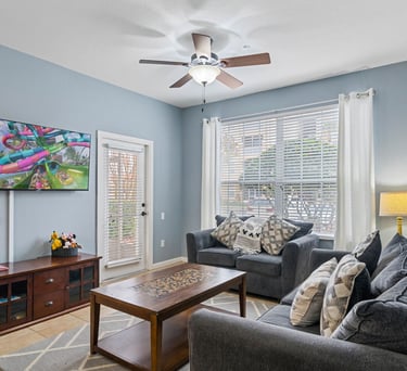 Spacious living area with large TV and access to screened-in patio