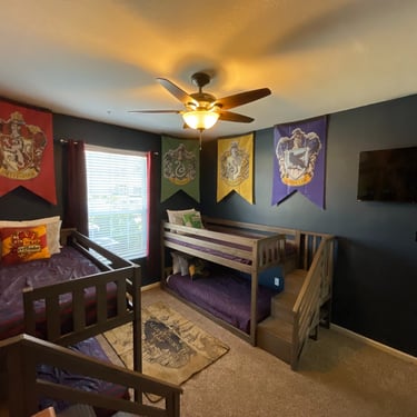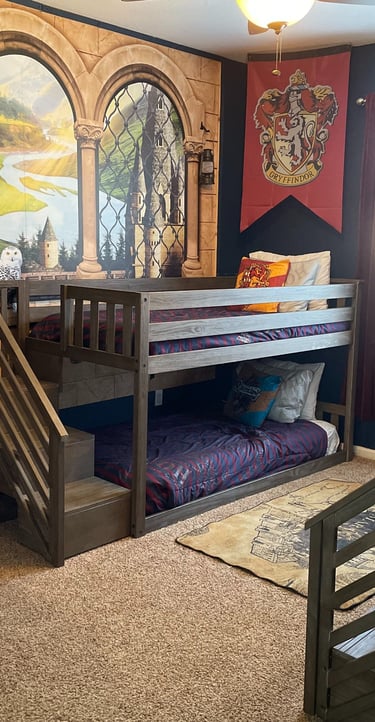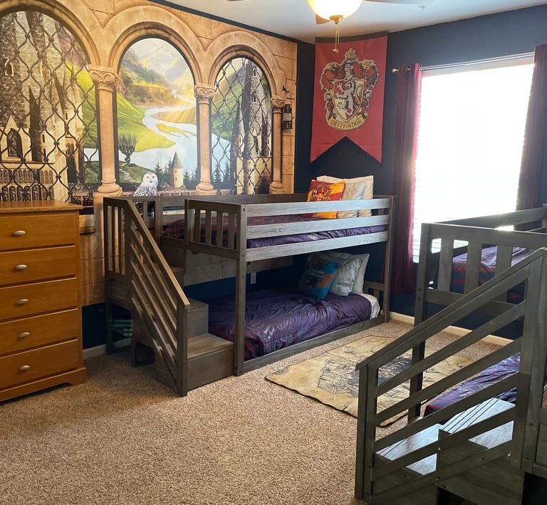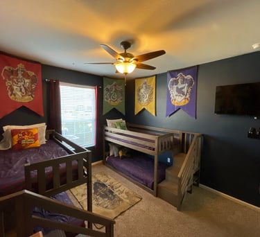 Experience a magical stay in our Harry Potter themed bedroom with 2 sets of bunk beds. These bunk beds are low to the ground with stairs to upper bunk. Sleeps 4 wizards of all ages.