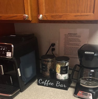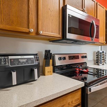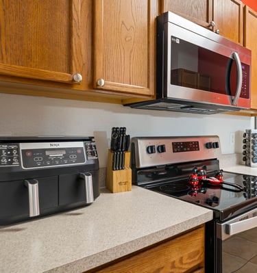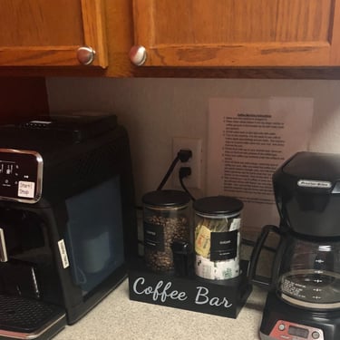Our well-equipped kitchen comes with modern appliances including fridge, stove, microwave, dishwasher, coffee maker, kettle, 2 and 4 slice toasters, popcorn maker, blender and a Mickey Mouse waffle maker. Brand new (2025) cutlery, dishes, pots & pans and air Fryer.